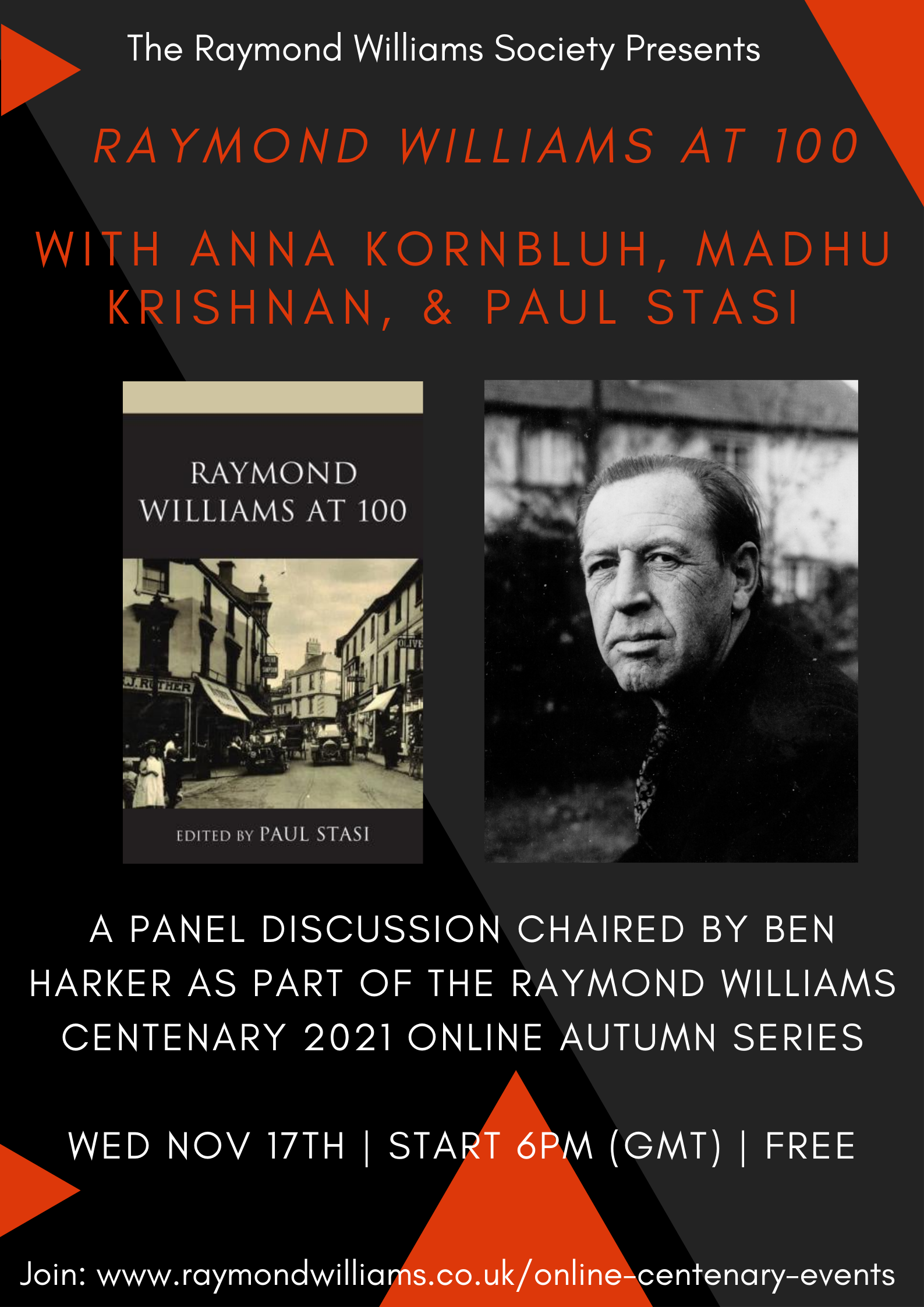 On Wednesday 17th November the society will host the final event in the online autumn series to celebrate Raymond Williams’s centenary. Our chair Ben Harker will be joined by Paul Stasi, the editor of a new book Raymond Williams at 100, alongside Madhu Krishnan and Anna Kornbluh, who have contributed chapters titled ‘Structures of Feeling, Late Capitalism and the Making of African Literature in the Global Literary Marketplace’ and ‘Mediation Metabolized’, respectively. Stasi’s chapter is on ‘Inexplicable Goodness: Raymond Williams, Charles Dickens and The Ministry of Utmost Happiness‘. The free talk will start at 6pm (GMT) and is hosted on Zoom with the link to join here. There’s no need to register, simply click on the relevant link at the start time.