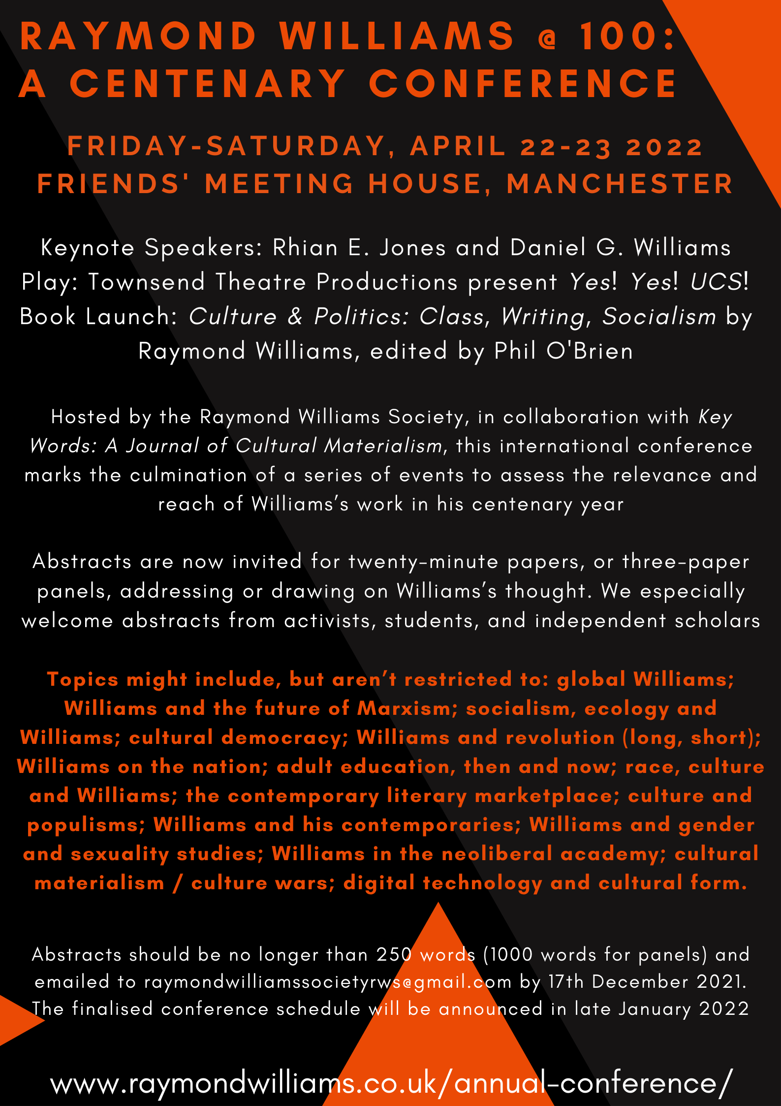 Abstracts are invited for twenty-minute papers, or three-paper panels, addressing or drawing on Williams’s thought. We especially welcome abstracts from activists, students, and independent scholars. Topics might include, but aren’t restricted to: global Williams; Williams and the future of Marxism; socialism, ecology and Williams; cultural democracy; Williams and revolution (long, short); Williams on the nation; adult education, then and now; race, culture and Williams; the contemporary literary marketplace; culture and populisms; Williams and his contemporaries; Williams and gender and sexuality studies; Williams in the neoliberal academy; cultural materialism / culture wars; digital technology and cultural form.
