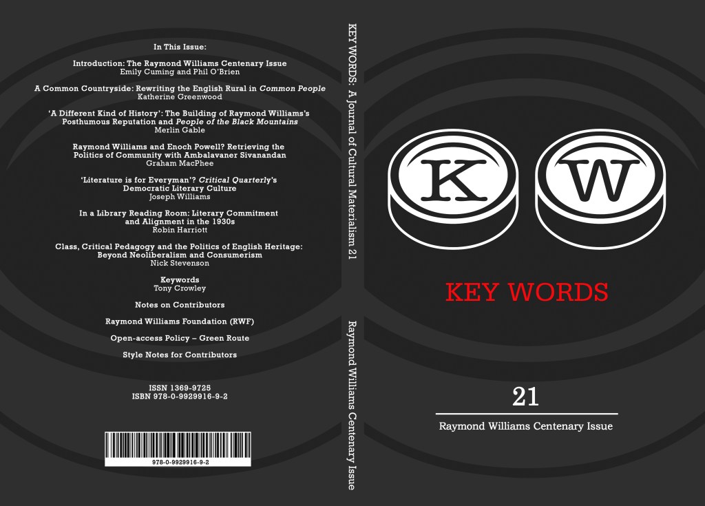 We would like to finish by thanking the people who attended and contributed to the ‘Raymond Williams @ 100’ conference and particularly the authors featured in this special issue for their work and commitment. Many thanks are also due to Liane Tanguay from all at Key Words for her exemplary work as reviews editor and editorial board member for many years, and welcome to Kate Spowage, a new editorial board member, who has edited this year’s reviews section. We are also delighted to welcome Hayley Toth to the editorial board, bringing expertise in literary sociology and colonial and postcolonial print cultures. This issue features another keyword entry by Tony Crowley on ‘woke’, which, as ever, aptly draws attention to the ways in which Williams’s method of close historical enquiry of culture and language as constitutive processes remains as relevant for the next 100 years as it has been for the last.