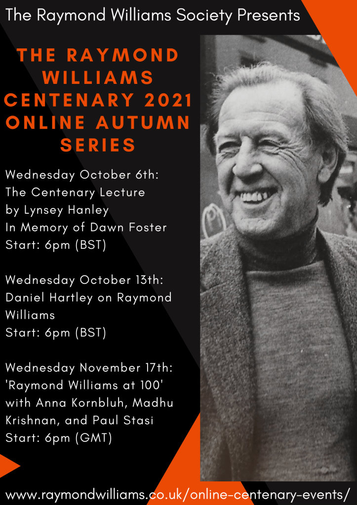 To mark Raymond Williams’s centenary we ran a series of online events throughout the autumn of 2021. On Williams’s birthday (Tuesday 31st August), there was a rare screening of his 1970 film Border Country, directed by Nicholas Garnham for the BBC series One Pair of Eyes. This was followed by a lecture series featuring Lynsey Hanley (6th October), Daniel Hartley (13th October), and Anna Kornbluh, Madhu Krishnan, and Paul Stasi (17th November). Recordings below.